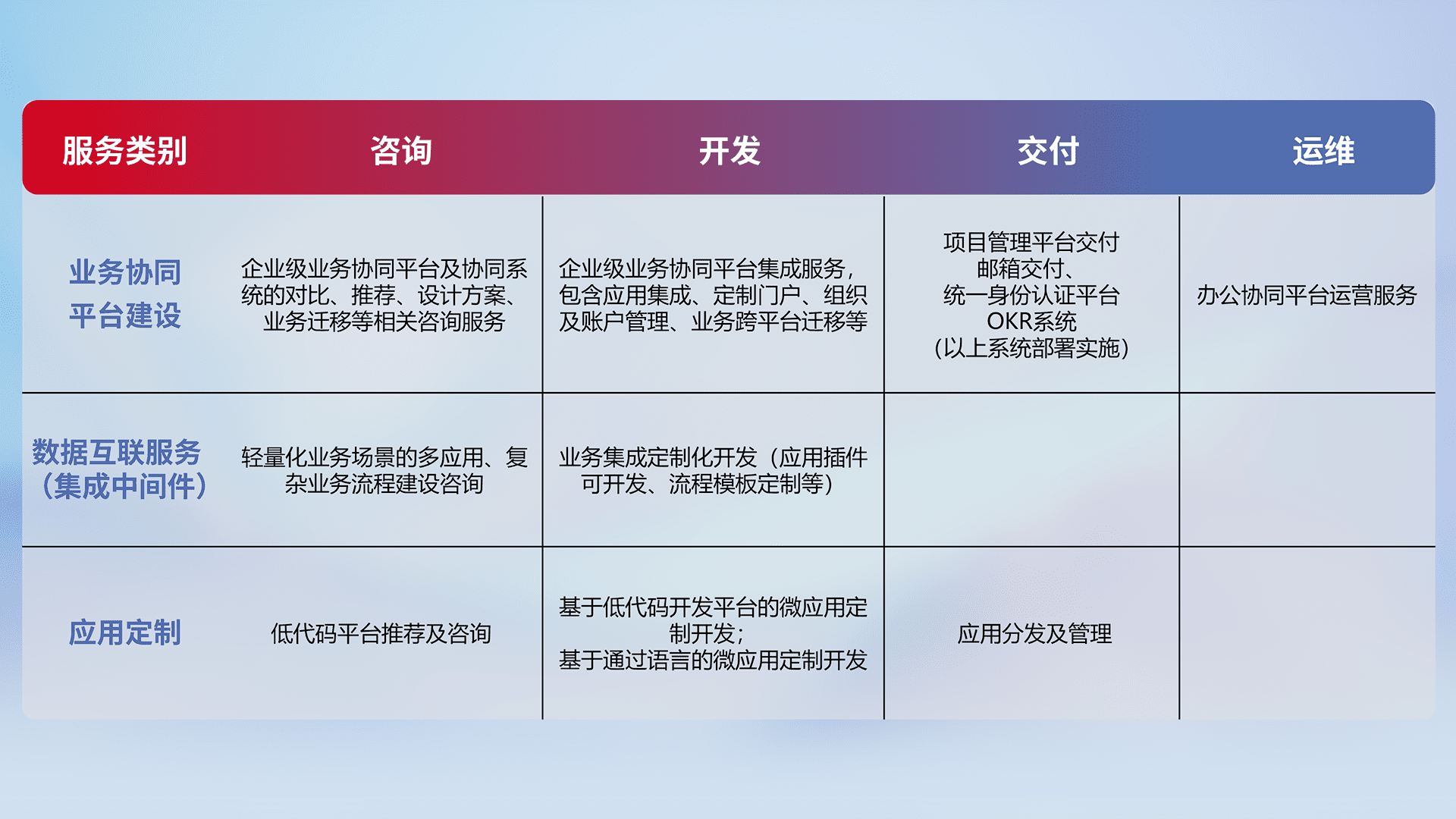 针对钉钉、、、企微、、IDaas等平台级产品提供产品的规划、、方案、、、交付、、、、定制化开发等服务,,实现如统一协同办公、、智能客户服务、、、、混合会议管理、、、、智能数据查询、、、、等业务场景,,,,实现数字化转型。。